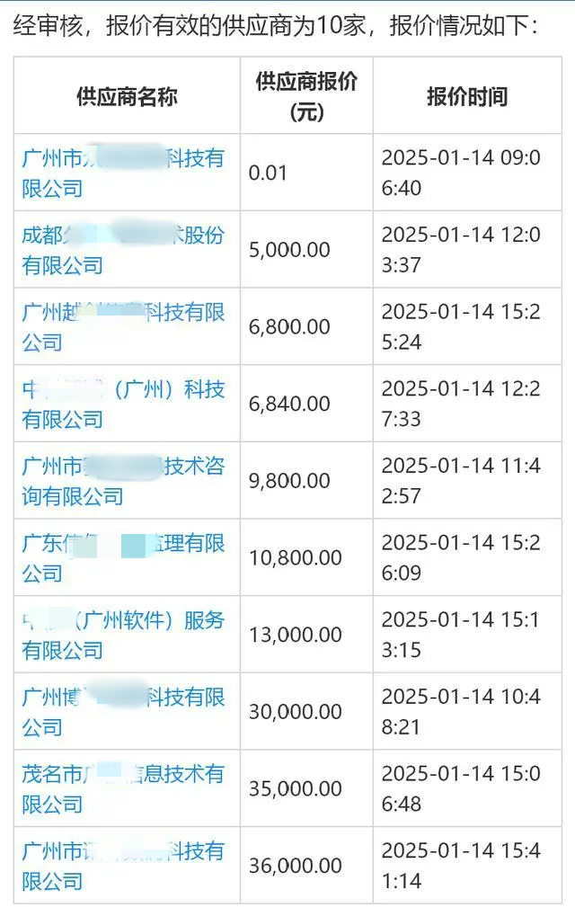 成交公告中称,经审核,10家供应商均能实质性响应该项目的采购需求。根据采购公告中的成交规则,报价时间截止后,采购人推荐的实质响应采购需求的供应商有3家以上,系统按照报价由低到高的顺序,默认最低报价供应商为成交供应商。最终,广州市某信息科技有限公司以0.01元的价格成交。