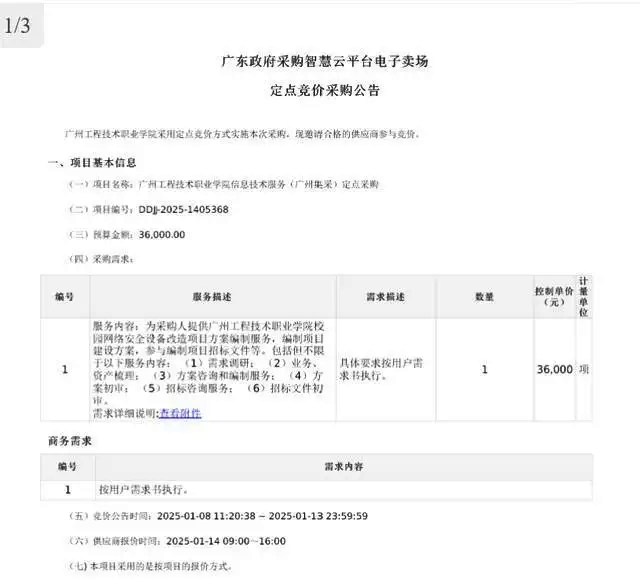 近日,一份《广东政府采购智慧云平台电子卖场定点竞价成交公告》在网上流传,该公告显示,1月14日,名称为“广州工程技术职业学院信息技术服务(广州集采)定点采购”的项目,本次定点竞价项目采用公开邀请的竞价方式,被广州一信息科技有限公司以0.01元的金额中标。