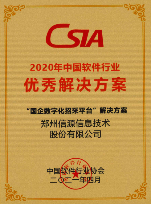 年会上,协会隆重发布多项大奖,信源“国企数字化招采平台”解决方案,荣获“2020中国软件行业解决方案“大奖。
