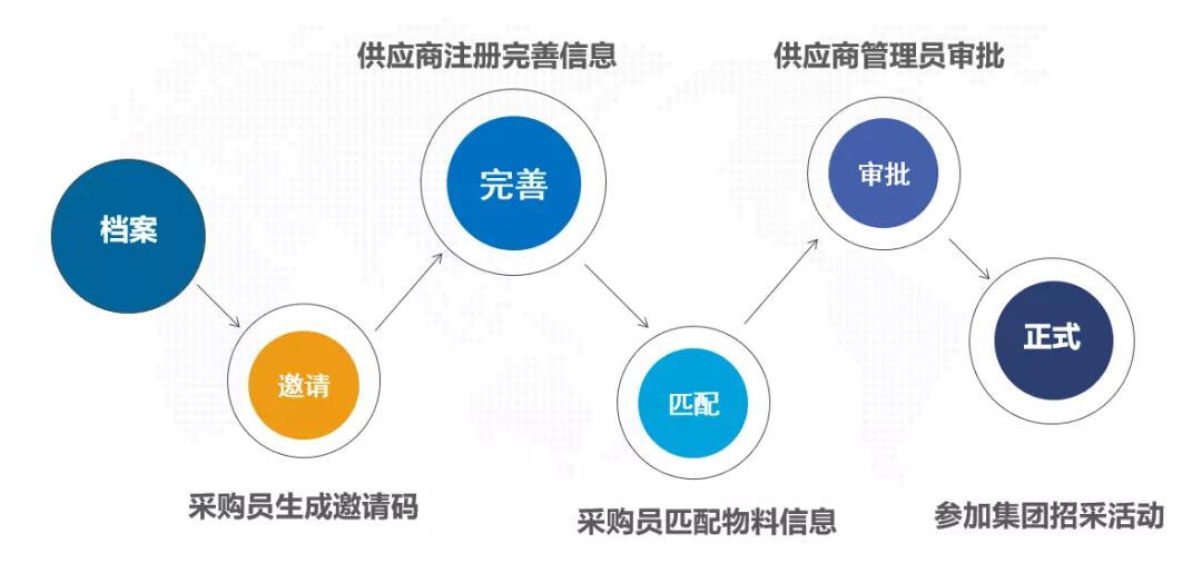 供应商完善完信息后第一步提交给邀请自己的采购员进行物料信息匹配;匹配完物料信息后提交供应商管理员进行信息核验。