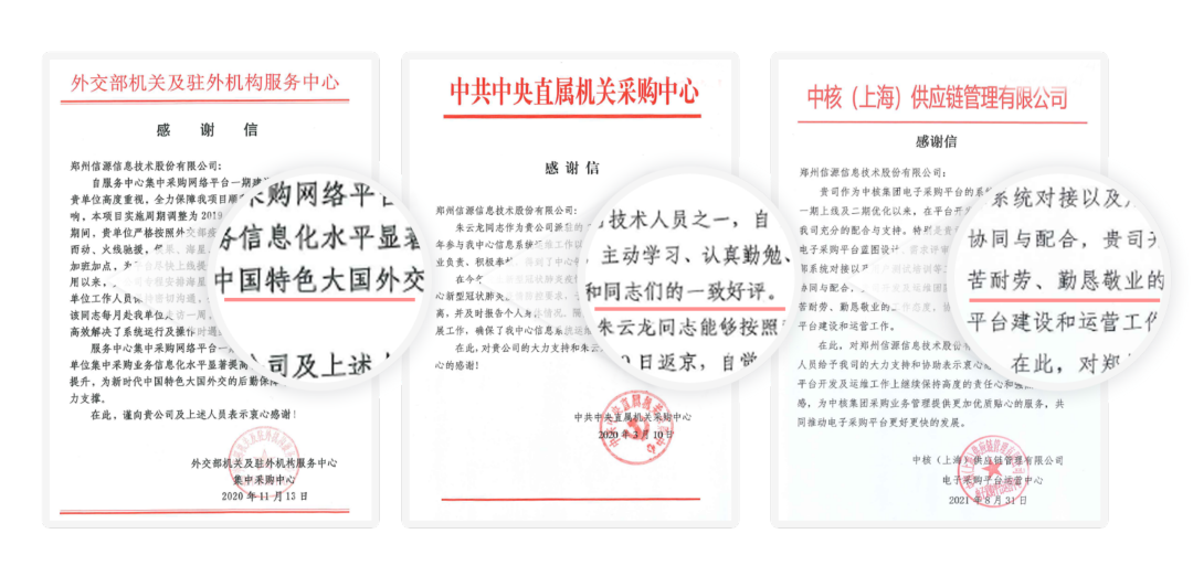 从客户的众多感谢信中,经常看到“刻苦耐劳”、“勤恳敬业”、“高技术水平”、“高响应速度”、“高品质服务”、“优秀的业务理解能力”、“高效的执行力”等高度评价。我们恪守承诺,让客户的需求落地有声,执行有力。我们坚守信义,保护用户信息,照亮招采行业市场。我们践行诚信,经受住了时间的检验、市场的挑战。