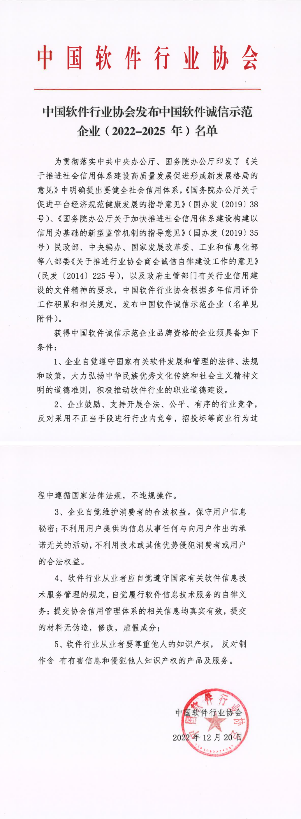 “中国软件诚信示范企业”评选是中国软件行业协会为贯彻落实国家健全社会信用体系,加强行业信用建设,树立软件行业诚信榜样,推动软件业高质量发展的重要举措。