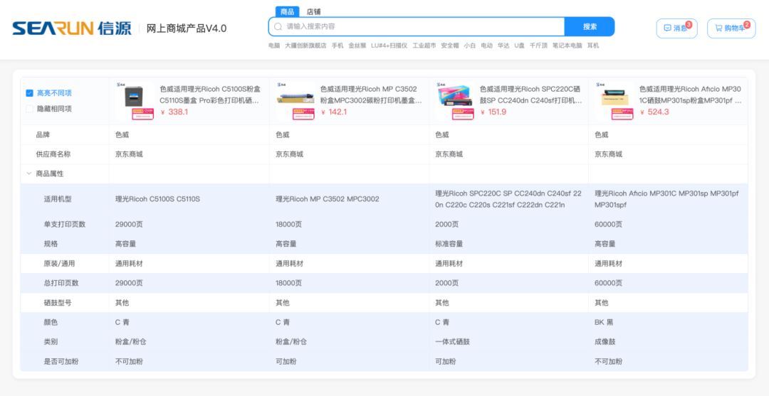 通过系统智能算法推荐,用户可以快速识别性价比高的商品进行采购,在线“货比三家”、“价比三家”。一键跨平台商品横向参数PK,支持多属性(规格、品牌、服务、供应商评分等)参数对比,为企业采购配上“火眼金睛”。